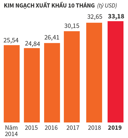Xuất khẩu nông, lâm, thủy sản 10 tháng năm 2019 ước đạt 33,18 tỷ USD, tăng 1,6% so với cùng kỳ năm 2018. Trong đó, giá trị xuất khẩu nhóm nông sản chính đạt 1,4 tỷ USD, lâm sản chính đạt gần 1,05 tỷ USD, thủy sản đạt 834 triệu USD và chăn nuôi đạt 55 triệu USD.