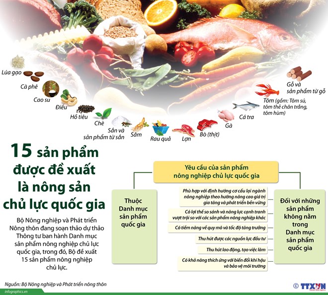 Bộ Nông nghiệp và Phát triển Nông thôn đang soạn thảo dự thảo Thông tư ban hành Danh mục sản phẩm nông nghiệp chủ lực quốc gia, trong đó, Bộ đề xuất 15 sản phẩm nông nghiệp chủ lực gồm: lúa gạo, cà phê, cao su, điều, hồ tiêu, chè, sắn và sản phẩm từ sắn, sâm, rau quả, thịt heo, thịt bò, gà, cá tra, tôm (gồm tôm sú, tôm thẻ chân trắng, tôm hùm), gỗ và sản phẩm từ gỗ.