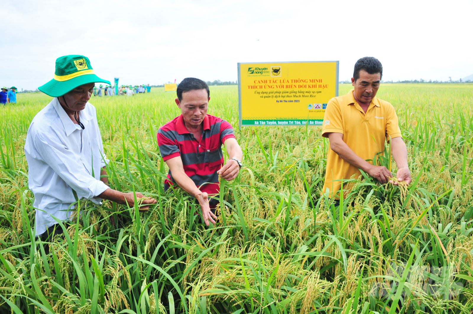 Vụ hè thu 2023, Công ty Cổ phần Phân bón Bình Điền, Công ty Bayer Việt Nam, Công ty Sài Gòn Kim Hồng và Trung tâm Khuyến nông 3 tỉnh An Giang, Kiên Giang, Sóc Trăng đã thực hiện chương trình trình diễn mô hình canh tác lúa thông minh thích ứng với biến đổi khí hậu, ứng dụng giải pháp giảm giống bằng máy sạ cụm, bón phân thông minh và quản lý dịch hại theo quy trình Much More Rice.