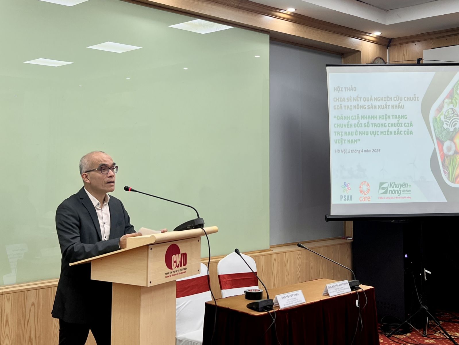 Sáng ngày 2/4/2025, tại Hà Nội, Đối tác Phát triển Bền vững Nông nghiệp Việt Nam (PSAV) phối hợp cùng Trung tâm Khuyến nông Quốc gia tổ chức Hội thảo chia sẻ kết quả nghiên cứu chuỗi giá trị nông sản xuất khẩu với chủ đề “Đánh giá nhanh hiện trạng chuyển đổi số trong chuỗi giá trị rau ở khu vực miền Bắc của Việt Nam”. Sự kiện thu hút hơn 50 đại biểu đến từ các cơ quan thuộc Bộ Nông nghiệp và Môi trường, doanh nghiệp, viện/trường/trung tâm nghiên cứu, tổ chức quốc tế, phi chính phủ và các hợp tác xã trồng, sản xuất rau quả.
