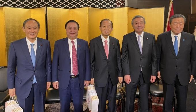 Bộ trưởng Lê Minh Hoan tặng quà OCOP và chụp ảnh lưu niệm cùng cựu Thủ tướng Nhật Bản Suga Yoshihide, cựu Tổng Thư ký Đảng Dân chủ Tự do (LDP), Chủ tịch Liên minh Nghị sỹ Hữu nghị Nhật - Việt Nikai Toshihiro