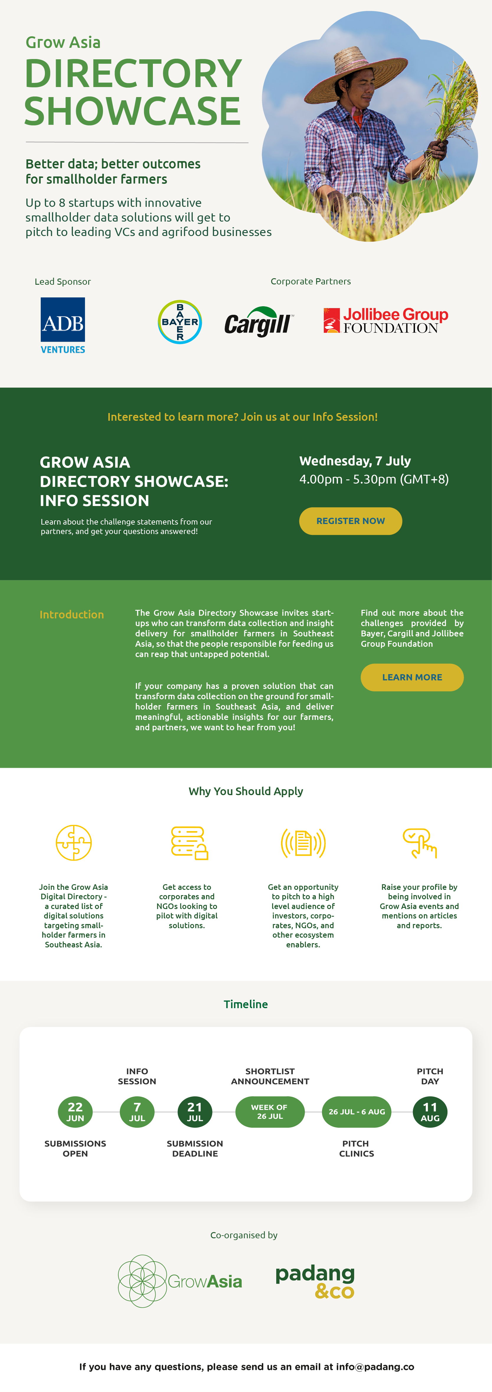 Trang dữ liệu Kỹ thuật số của Grow Asia hiện đang kêu gọi các công ty khởi nghiệp, có tiềm năng chuyển đổi việc thu thập dữ liệu và cung cấp thông tin cho các nông hộ nhỏ ở Đông Nam Á, từ đó giúp nông hộ này có khả năng khai thác tối đa tiềm năng của mình.