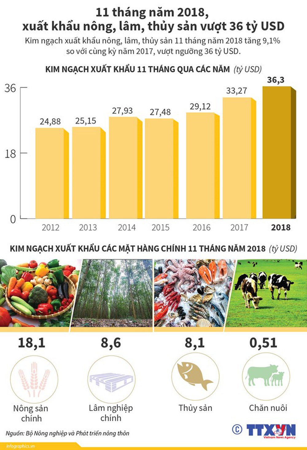 Theo báo cao, kim ngạch xuất khẩu nông lâm thuỷ sản tháng 11 năm 2018 ước đạt 3,61 tỷ USD. Như vậy, tổng giá trị xuất khẩu 11 tháng năm 2018 đạt 36,3 tỷ USD, tăng 9,1% so với cùng kỳ năm 2017.